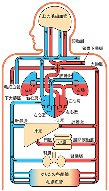 心臓の左の下の部屋、左心室からは大動脈と呼ばれる大きな血管が出ています。左心室が収縮することにより、左心室内の血液が体全体に動脈を通って行きわたり、体の隅々まで酸素や栄養を運びます。 酸素を全身に提供した後は、静脈を通って心臓に帰ってきます。 静脈は右心房に繋がっており、酸素を失った血液は右心房に貯留されることになります。 右心房に貯留された血液は、右心房の下の部屋、右心室へ移動し、その後右心室から肺に送り出されます。 肺では、呼吸によって取り込んだ空気と血液を混ぜ合わせることによって再度酸素を含んだきれいな血液になり、左心房に帰ってきます。左心房に貯留された酸素を含んだ血液は、左心室を経て再度全身に酸素を提供すべく送り出されます。このように、血液は心臓を使用して全身をぐるぐる回っているのです。 この心臓の血液を送り出す力が弱まってしまった状態を「心不全」と言います。