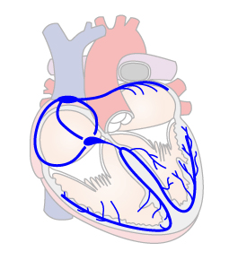 正常な心臓は、「洞結節」というところから電気が出ることで運動を開始します。洞結節は、電気が出るところすなわち発電所です。洞結節は右心房の上のほうにあります。 ここから出た電気は、右心房と左心房すなわち上の部屋を収縮させます。 心房全体にいきわたった電気は、心房と心室を繋いでいる「房室結節」と呼ばれる変電所に集まりその後に心室へと伝播していきます。 房室結節から心室全体に電気が伝わると、心室が正常に収縮します。この洞結節から心室までの電気の通り道を「心臓の刺激伝導系」と呼び、順序良く電気が伝達するとようやく血液が心臓から駆出されます。 この刺激伝導系に異常をきたすと、「不整脈」が発症します。
