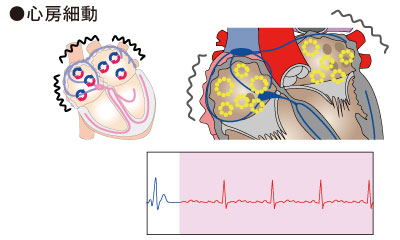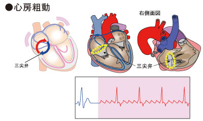 心房内で電気回路が出現し電気興奮が旋回してしまうことで頻脈が出現するものや、心房内の限局した部位での速いリズムでの電気興奮により頻脈が出現するものがあります。