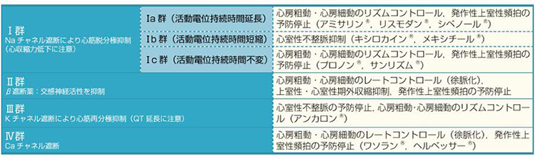 抗不整脈薬は種類が多く、薬理作用は多岐にわたります。 ここではVaughan Williams(ボーンウィリアムス)分類(表1)にしたがって表記を行います。