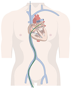 心臓の右側には静脈血が流れておりますので、カテーテルは静脈系の血管を通し心臓の右側に入ります。