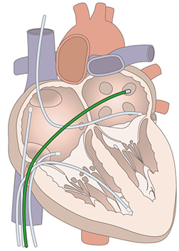 心臓電気生理学的検査とは、電位を記録する直径2~3mmの電極カテーテルを足や首の太い血管から心臓内に挿入し、心臓の中のいろいろな場所の心電図を記録しながら電極カテーテルを通して心臓を電気的に刺激する検査です。