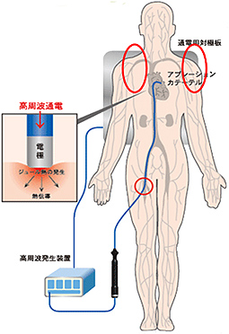 カテーテルアブレーション(カテーテル心筋焼灼術)はカテーテル(細くて長い管のような道具)を血管内より心臓内へ到達させ不整脈の原因を熱で焼灼することにより治療する方法で不整脈の根治を目標として行います。発作性上室性頻拍、心房細動、心房粗動、心房頻拍、心室頻拍などの不整脈が適応となります。カテーテルを使用しますので、大きな傷を作らずに済み、全身麻酔を必要としないため回復も早く、入院期間も3~4日間で済むことがほとんどです。疾患により治癒率は異なりますが、発作性上室性頻拍や通常型心房粗動では約90%以上、発作性心房細動で約80%以上とかなり高い確率で治癒が期待できます。再発した場合でも再度アブレーション治療を行うことで治癒率はさらに高められます。