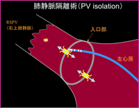 心房細動の原因のほとんどは左心房と肺をつないでいる血管である肺静脈にあります。肺静脈で生じた異常な電気信号が左心房へ伝わることで心房細動が起きることが知られています。したがって、肺静脈と左心房の間の電気の通り道を焼灼によって壊すことで肺静脈から左心房に異常信号が伝わらないようにします。このような方法を肺静脈隔離術といい、心房細動アブレーションにおける最も重要な術式です。患者様によっては、肺静脈以外から異常信号が認められ、肺静脈隔離術のみでは完治しない場合もありますので、追加焼灼が必要となることもあります。一般的に、心房細動に対するアブレーションの治癒率は不整脈の進行具合で変わってきます。初期段階である発作性心房細動(心房細動が自然にとまる場合)では約90%、持続性心房細動(心房細動が持続して1年未満)では約70%、長期持続性心房細動(心房細動が持続して1年以上)では約50%です。進行した心房細動ほど、複数回の治療が必要となる場合が多いです。