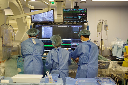 カテーテルアブレーションではX線で体内を透視しながらカテーテルを進めていきますので専用の血管撮影室で行います。疾患により異なりますが、カテーテルの挿入部位は足の付け根にある血管や肩(鎖骨の下)にある血管がほとんどです。局所麻酔の後、足の付け根や肩の血管に針を刺し、電極カテーテルや治療用カテーテルを心臓内へ進めていきます。心臓内の特定部位にカテーテルを留置し、心臓電気生理検査や造影検査を行った後、不整脈の発生源や回路を熱で焼いて治療します。