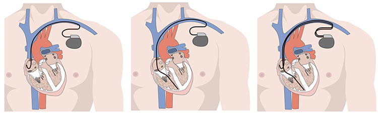 ペースメーカ植込みは局所麻酔下で行います。まず左右どちらかの鎖骨の皮膚を数センチ切開し、皮下にペースメーカが入る小さなポケットを作ります。次に、鎖骨の下を通る太い静脈に、ペースメーカ本体と心臓を結ぶリードと呼ばれる細い導線を挿入します。リードはペースメーカの種類により2本使用する場合と1本だけ使用する場合があります。最後に、リードをペースメーカ本体につなぎ、本体を皮下のポケットにしまい、切開した部分を縫合して終わりです。手術はおよそ1~2時間で終了します。