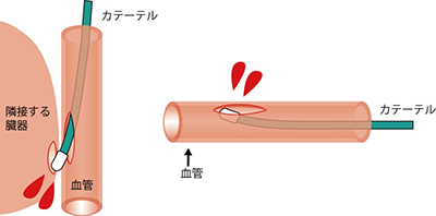 この合併症はごくまれですが、静脈や心臓の中でリードを進める際に、血管の壁、あるいは心臓の壁の一部をリードが貫通して起きます。