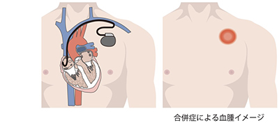 ペースメーカー手術で最も重篤な合併症です。ペースメーカーの本体やリードに細菌が付着して感染症がおこると治療は非常に困難で、多くの場合本体やリードを交換しなくてはなりません。本体のみの交換は難しくありませんが、リード交換はしばしば外科手術を必要とし、生命に関わる可能性もあります。手術時に感染を起こさなくとも、身体のどこかに傷がついたときは、そこから細菌が入って本体やリードに取り付いてしまうことがありますので、手術時に問題なかったといって安心はできません。頻度は0。5~2%と報告されています。